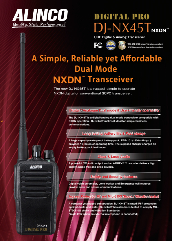 Bộ đàm DJ-NX45T sử dụng AMBE + 2 ™ VOCODER một công nghệ nén và số hóa giọng nói hiện đại loại bỏ can nhiễu để có độ rõ nét vượt trội ở các cường độ tín hiệu khác nhau cho tất cả các tính năng cuộc gọi kỹ thuật số.
