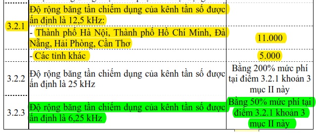 Với băng thông sử dụng 25 kHz mức phí được tính 200% so với mức thu ở trên.